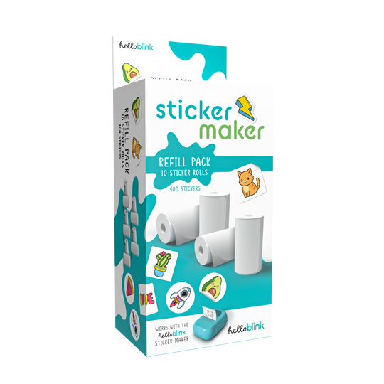 The Hello Blink Sticker Maker White Refill Pack is designed to keep the creativity flowing. This refill pack includes 10 rolls, with 5 rolls of round stickers and 5 rolls of square stickers, totaling 400 stickers. Perfect for continuing your sticker-making adventures.