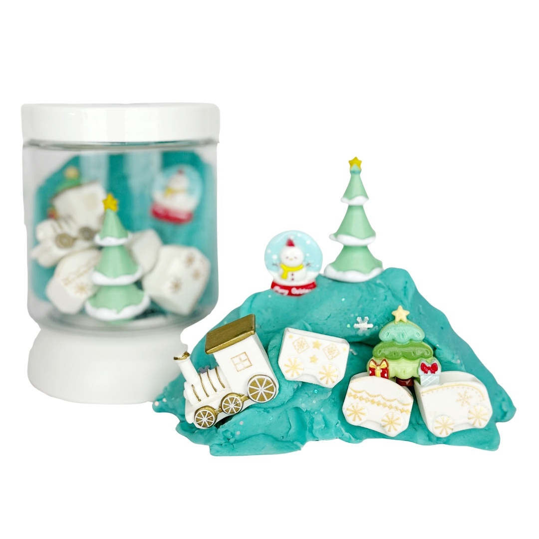 This pocket-sized sensory kit features silky-soft, lightly scented turquoise dough plus a festive collection of themed charms—including a snow globe, train car, snowy tree, and more!