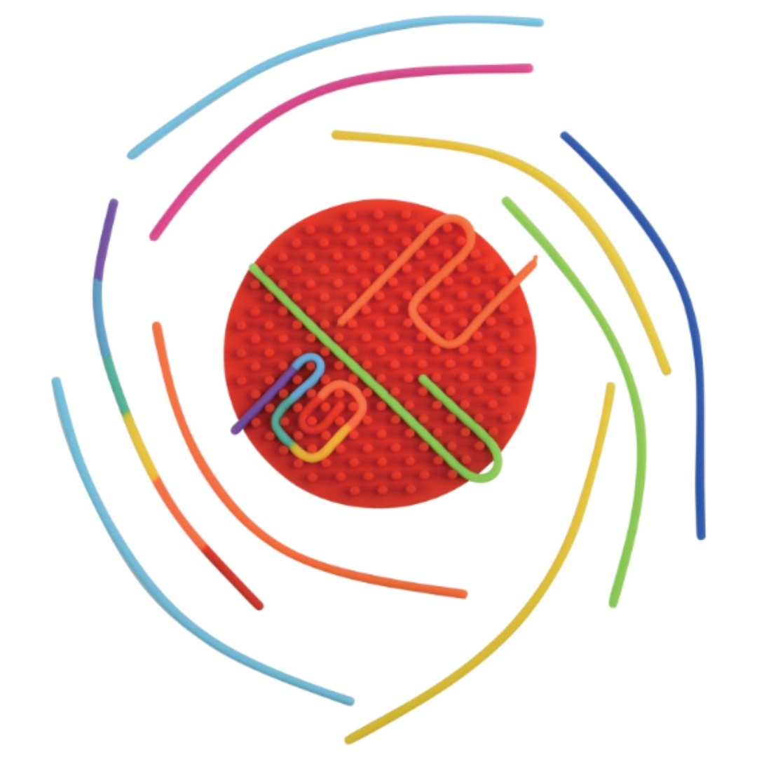 This brightly colored board features two maze-style sides and comes with 12 flexible silicone strings to trace, weave, and wiggle through the grooves.